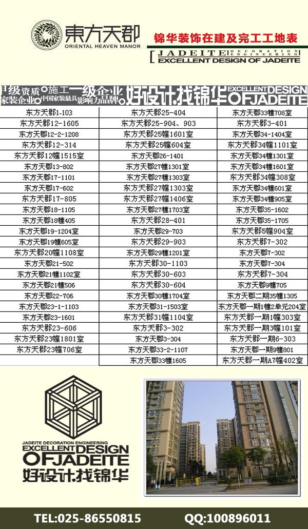 為了更好的讓東方天郡的業主了解錦華裝飾的整個工藝流程,錦華裝飾仙林片區分公司整理了所有東方天郡的完工及在建工地,歡迎大家來參觀。